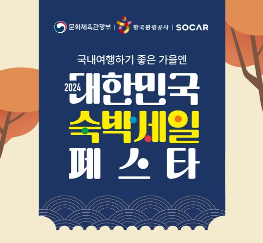 2024 대한민국 숙박세일페스타에 참여한 여러분을 위해 쏘카가 추가 혜택을 제공합니다! 숙박 예약 시 다양한 할인 쿠폰은 물론, 차량 대여까지 할인받을 수 있는 특별한 기회를 놓치지 마세요.