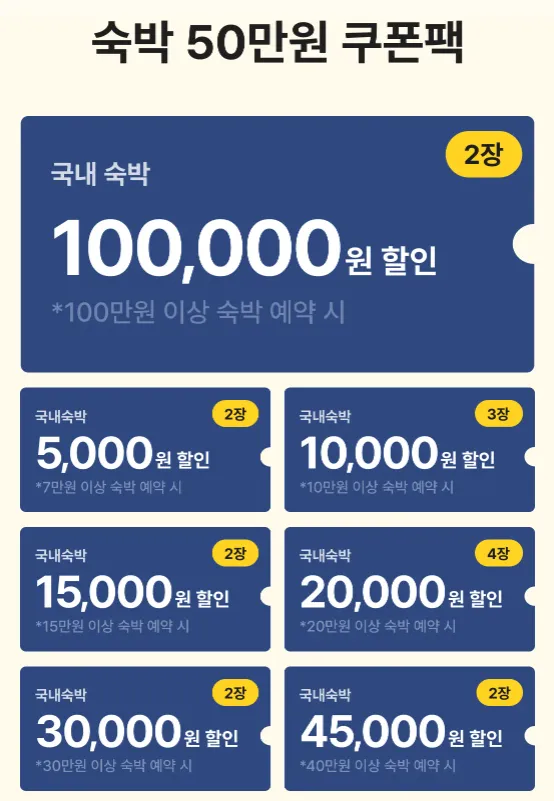 국내 숙박 예약 시 사용할 수 있으며, 100만원 이상 숙박 예약 시 10만원 할인부터 다양한 할인 혜택이 적용됩니다.