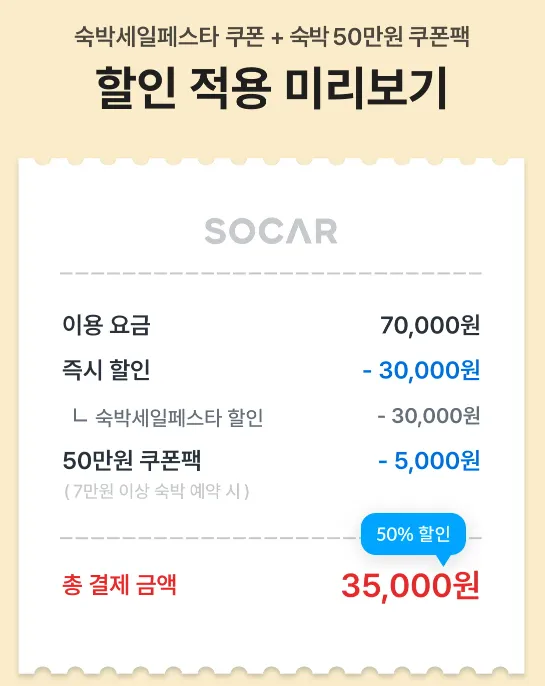 대한민국숙박페스타 중복 할인 쿠폰 - 쏘카 숙박 50만원 쿠폰팩