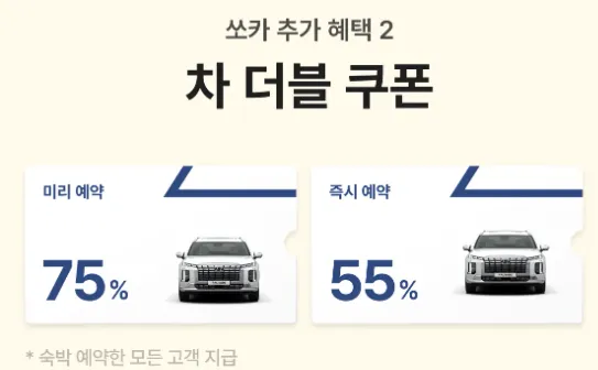 쏘카에서는 차 더블 쿠폰을 통해 최대 75%까지 할인된 금액으로 차량을 대여할 수 있는 혜택을 제공합니다.