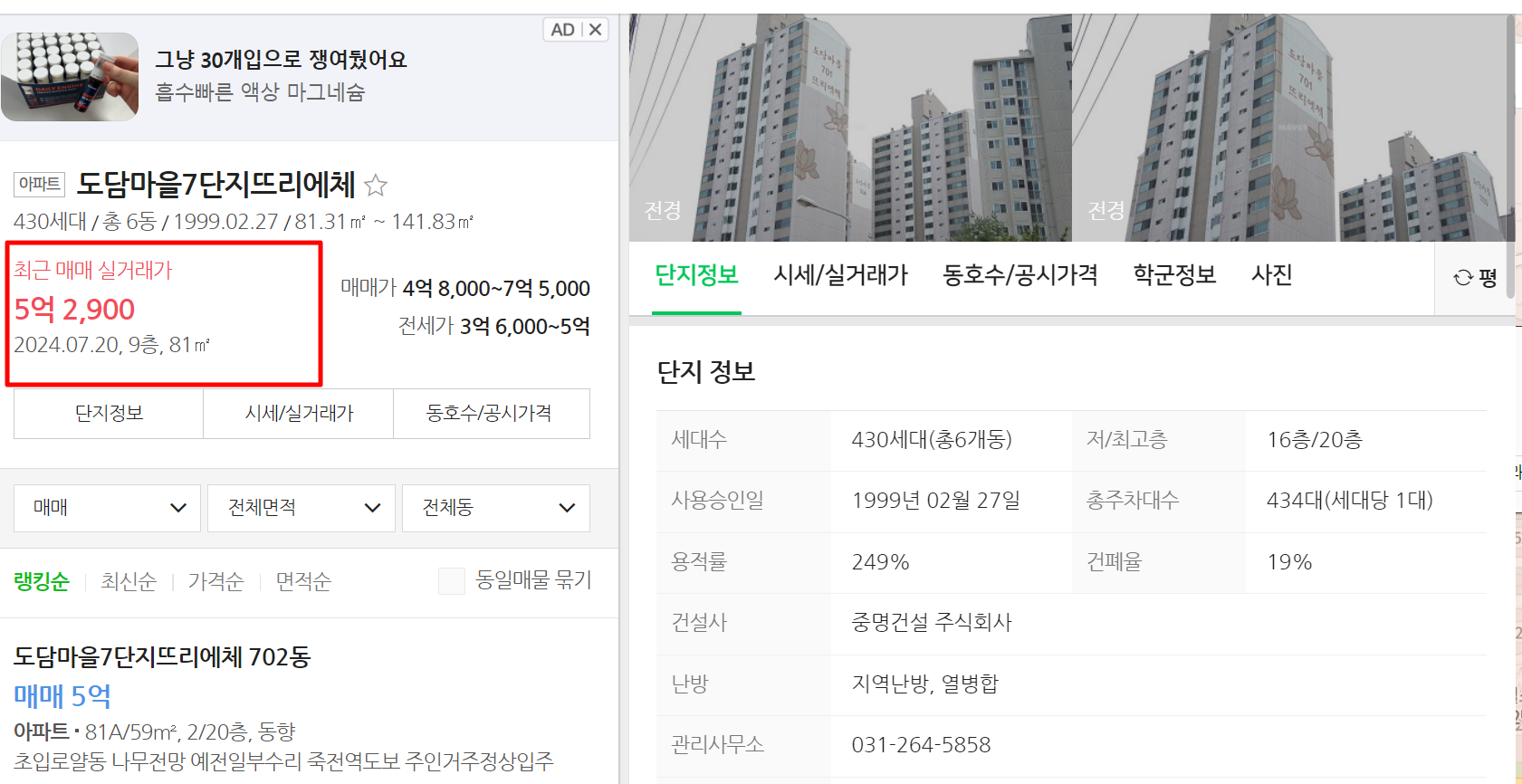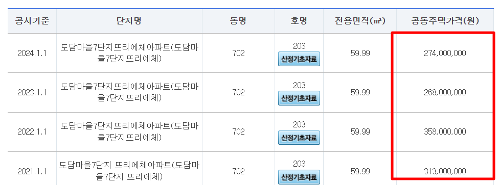 도담마을 7단지 뜨리에체 아파트의 경우, 최근 매매가격은 약 5억 원이지만, 국토교통부에서 확인한 공시지가는 2.74억 원입니다. 공시가격은 매매가격과 다를 수 있으므로, 재산세 계산을 위해서는 반드시 공시가격을 확인해야 합니다.