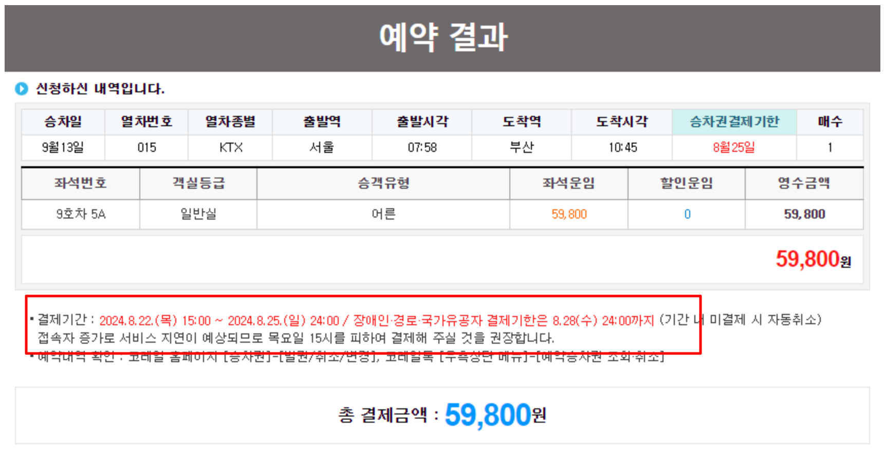 5. 추석 열차 예약 결과 학인하고 결제일정 확인