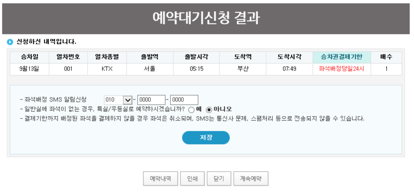 이 화면은 KTX 열차의 추석 예약 대기 신청 결과를 보여주는 화면입니다. 예약 대기를 신청한 상태에서 확인할 사항들이 몇 가지 있는데, 즉, 지금 바로 좌석이 배정된 것이 아니라, 좌석이 배정될 때까지 대기 상태로 있는 것입니다.