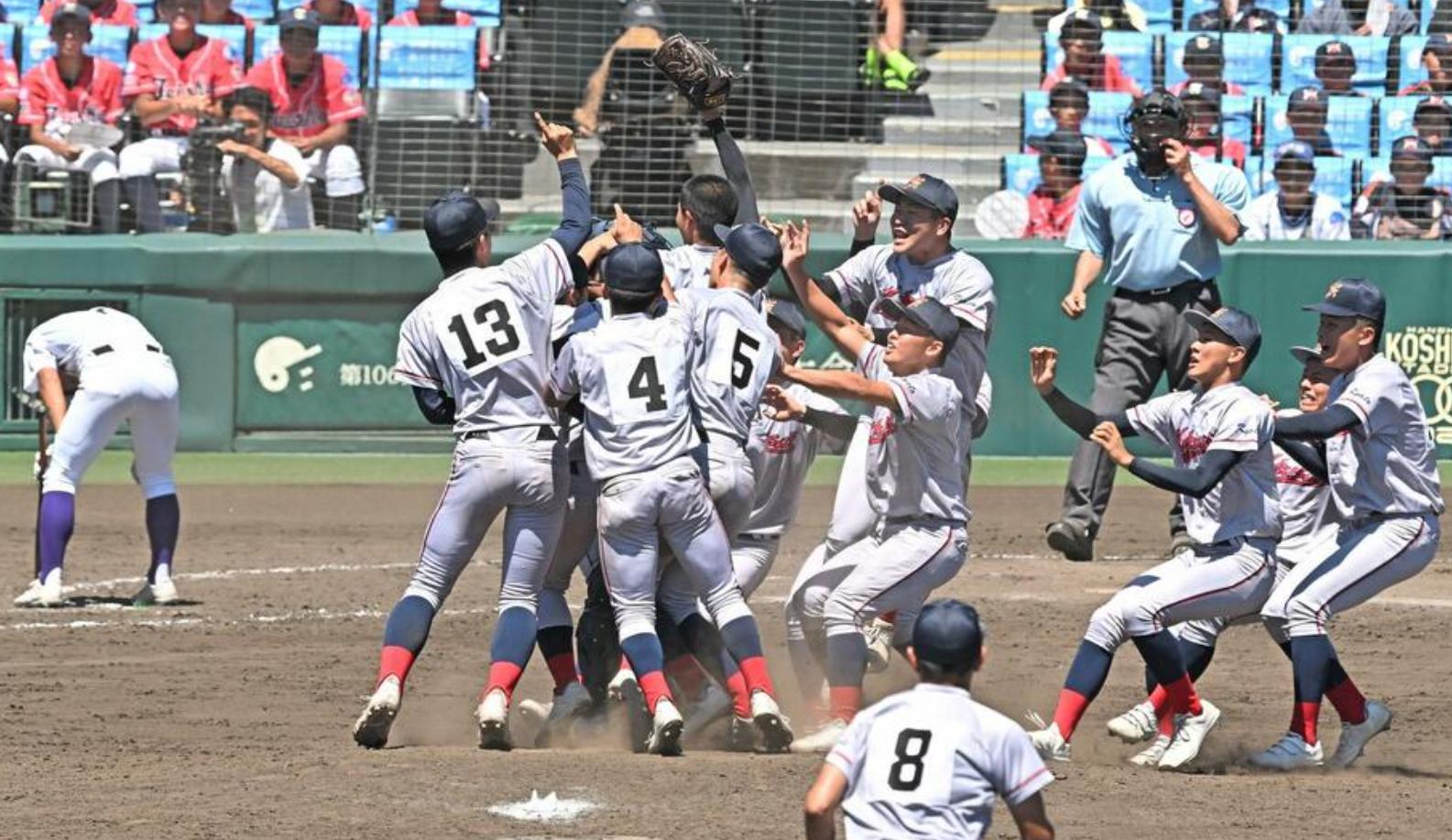 "먼저 양 팀 모두에게 훌륭한 경기를 보여주셔서 감사합니다. 서로 한 발짝도 물러서지 않은 접전이었습니다. 그리고 더운 날씨 속에서도 양국의 선수들이 열심히 플레이하는 모습을 보고 감동받았습니다. 먼저 교토국제가 10회 초에 포볼과 희생 플라이로 2점을 선취했습니다. 그 후, 간토다이이치는 무사 만루의 기회를 얻었지만, 교토국제의 니시무라가 1실점으로 막아내며 첫 우승을 거머쥐었습니다. 정말로 결승전에 어울리는 멋진 경기였습니다. 감동을 주셔서 감사합니다."