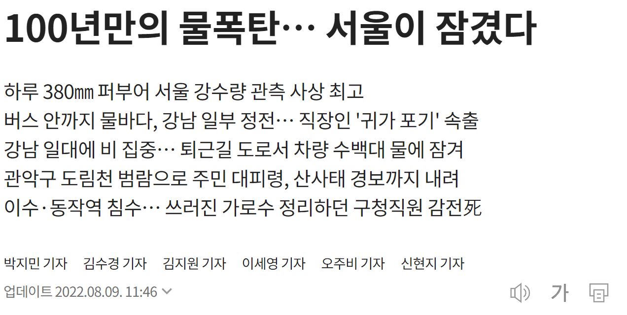 이 때 서울 하루 380mm가 내렸습니다. 도로가 범람하고 배수가 안되서 엄청 난리가 났었습니다.