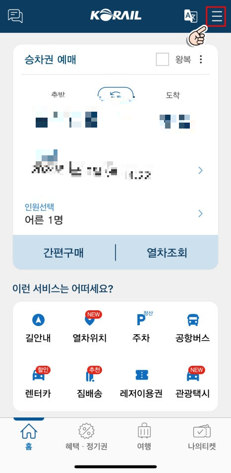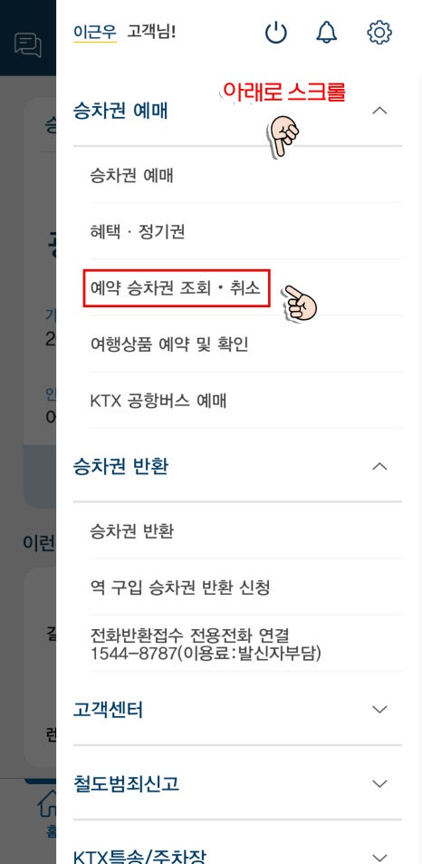 - 그런 다음, 화면을 아래로 스크롤하여 '예약 승차권 조회·취소' 메뉴로 들어가 주세요.