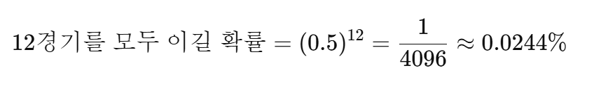 12경기를 모두 이길 확률은 다음과 같이 계산됩니다