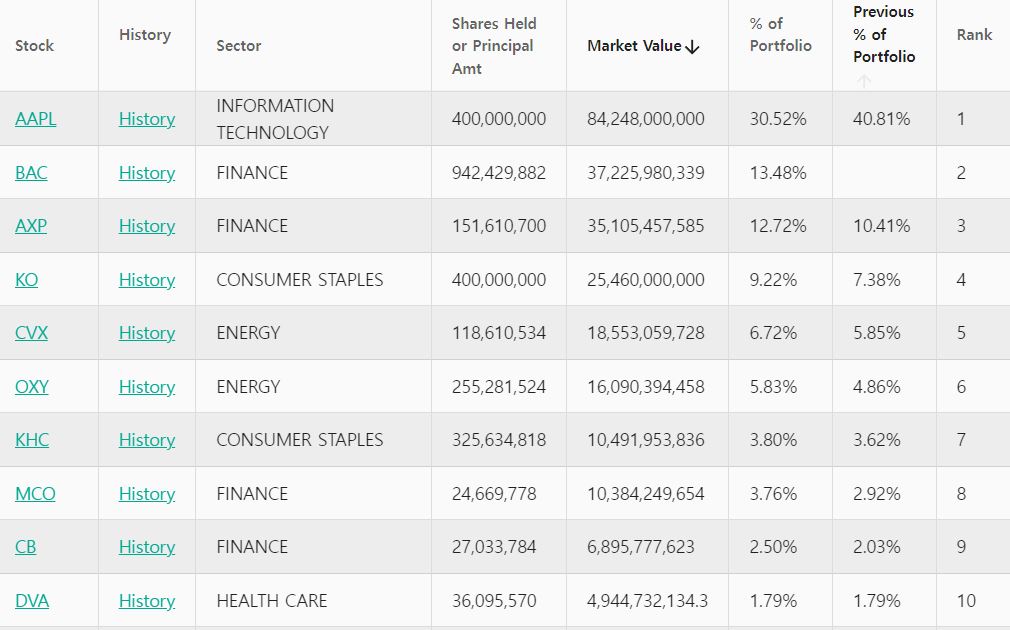 워렌 버핏 포트폴리오 투자 회사 탑 10 종목