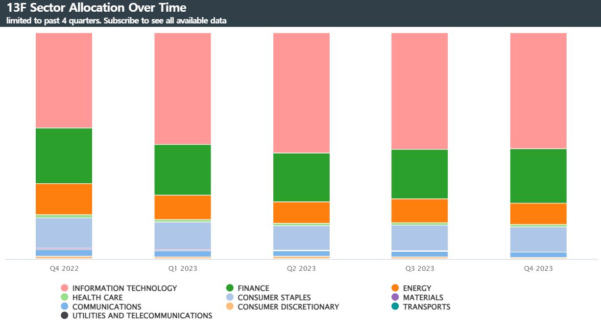 IT부분 중 애플은 줄어들었지만 전체 비중은 늘었고 금융 부분도 예전보다는 조금 줄어든 추세이긴 하네요. 소비재부분도 여전히 투자중이구요.